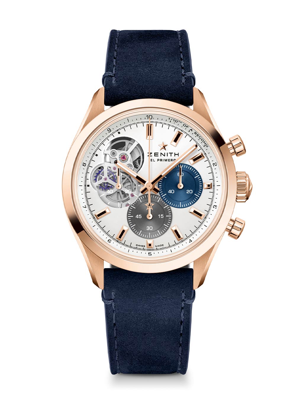 ゼニスの代名詞ともいえる傑作ムーブメント「エル・プリメロ」の魅力が存分に詰まったフラッグシップ「クロノマスター・オープン」のハイエンドモデル。K18ローズゴールドの輝きを纏い、現代的でどんなスタイルやシーンにもマッチするクロノグラフです。1/10秒の精度で計測かつ読み取る事が出来る唯一無二のクロノグラフの最新型「エル・プリメロ3604」キャリバーを搭載し、60時間パワーリザーブを実現。直径39.5mmのユニセックスなケースサイズに、オープンデザインの文字盤からシリコン製のアンクルとガンギ車をはじめ繊細で息をのむ美しさの高振動ムーブメントの調速機構を鑑賞することができます。
