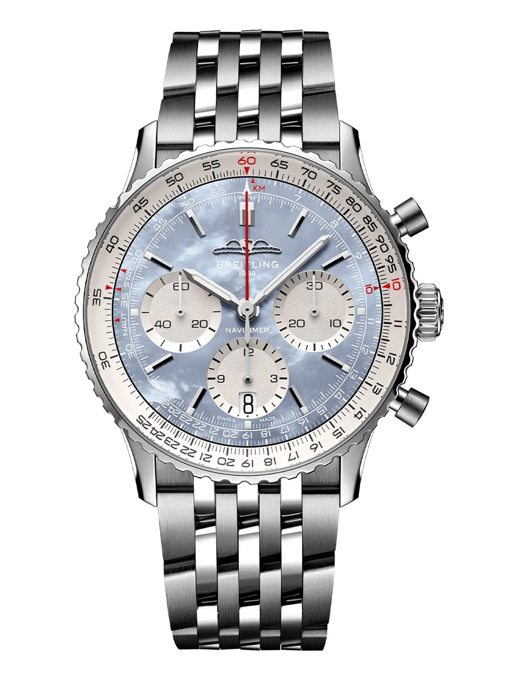 1952年の発表から航空時計のシンボルとして君臨する傑作コレクション「ナビタイマー」より41mm径の日本限定新作モデル。美しくエレガントなマザー・オブ―・パール文字盤のモデルは常に高い人気を誇り、その中でもミステリアスななブルーの貝文字盤は稀少です。ムーブメントは約70時間のパワーリザーブを誇るCOSC公認クロノメーターの自社開発製造キャリバーB01を搭載。クロノグラフを搭載したナビタイマーに、光の干渉を受けて煌めくMOPのナチュラルカラーが映えるスペシャルエディションとなります。