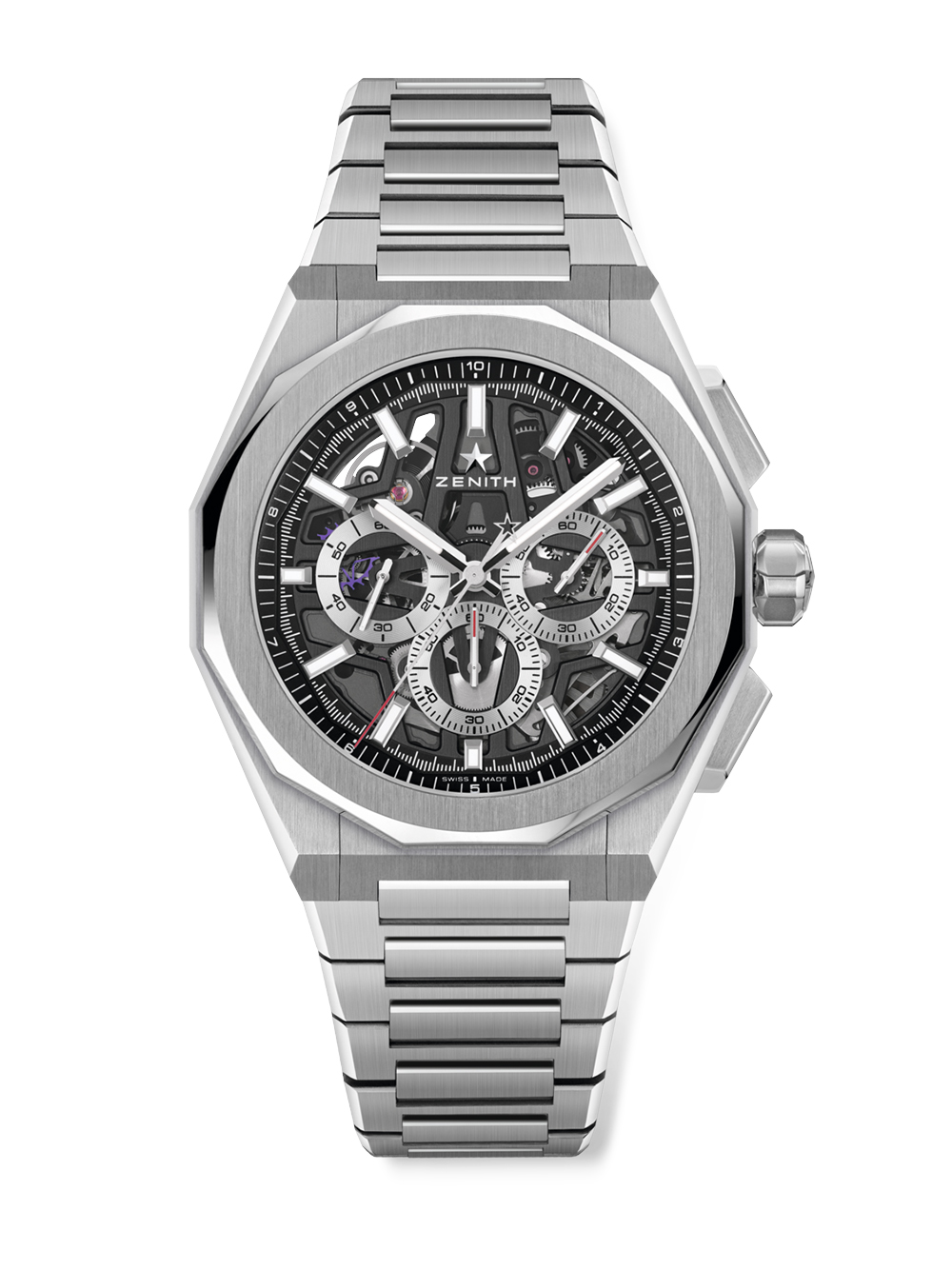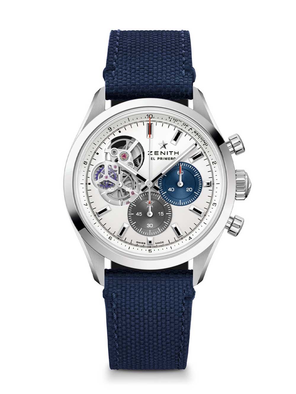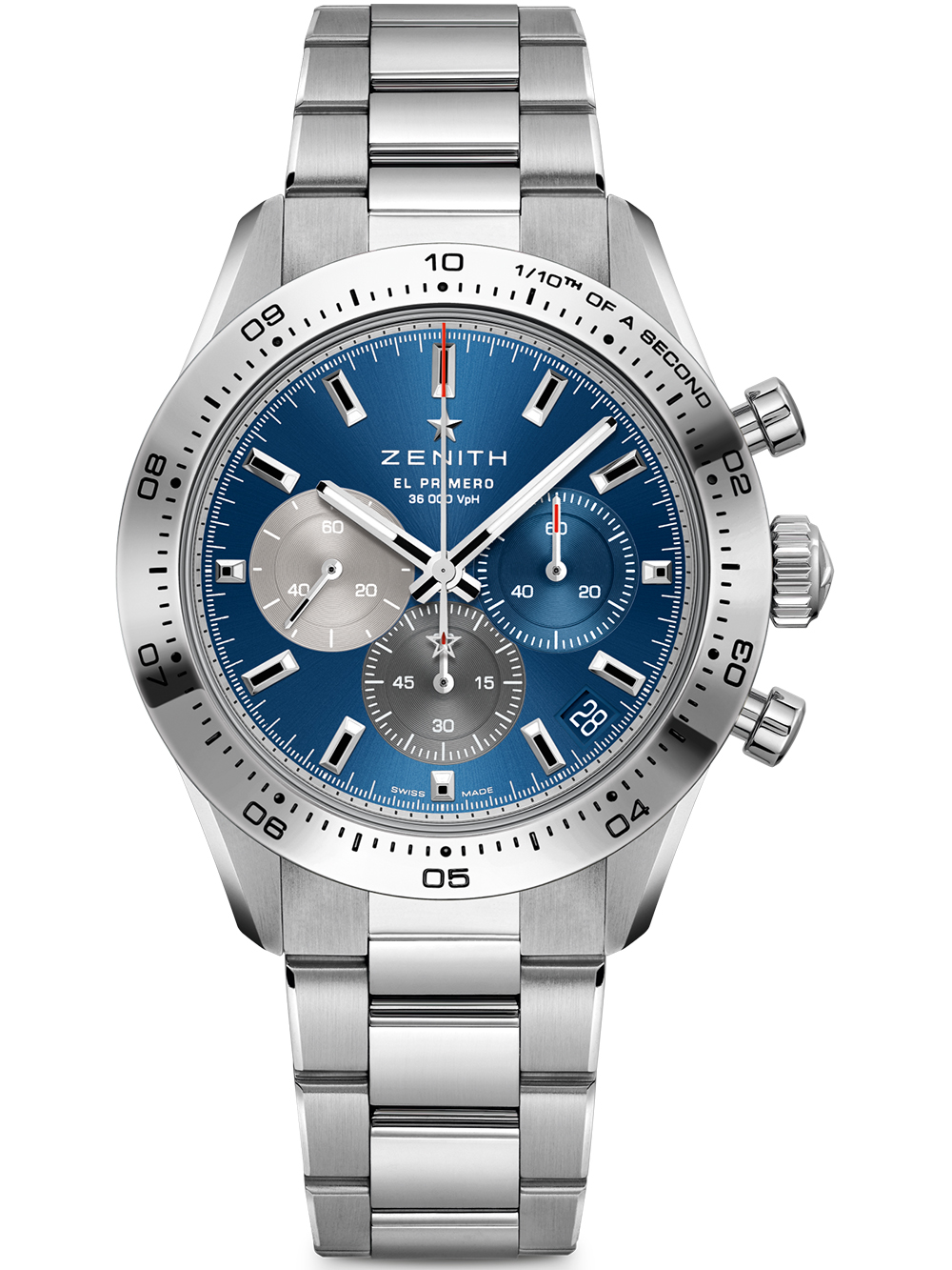 1865年創業、スイス屈指の名門マニュファクチュールブランド「ゼニス」より、量産型では世界初となる1/10秒計測を可能とする高精度クロノグラフ「エル・プリメロ3600」キャリバーを搭載した新世代のクロノマスター。1969年に発表された初代モデルより踏襲した3色使いのインダイヤルにブランドを象徴する「天頂の星」が輝く夜空を彷彿とさせるブルーの文字盤とステンレススティール製ベゼルを取り入れて、現代的かつスポーティーに進化を遂げました。41mm径に抑えられたケースとテーパード仕様のブレスレットが装着感を高め、普段使いにも最適です。50年以上に渡る探求を重ねた現在技術との融合を示すパワーリザーブは60時間を誇ります。