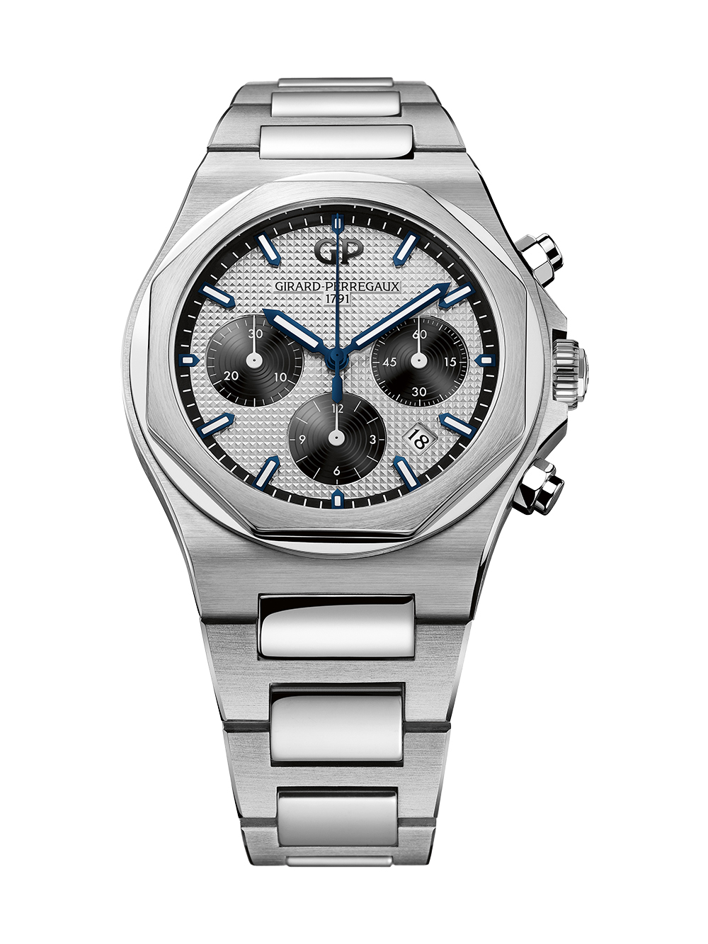 42mm径「ロレアート・クロノグラフ」より、スイスと日本の国交樹立160周年を記念した、日本限定100本の希少モデル。文字盤は日本文化に敬意を表し、またそこから着想を得たジャパン・ブルー「藍色」を採用しております。ケースとブレスレットは、強靭で硬く、耐食性に優れ、非磁性で低アレルギー性の素材である、軽量のグレード5チタン製です。円と八角形を組み合わせたケースには部分的にポリッシュ仕上げを施し、隣り合うサテン仕上げとエレガントなコントラスを成すよう、輝きを出しました。ロレアートの伝統に則り、文字盤はクル・ド・パリ装飾が施された華やかなジャパンブルー。カウンターとフランジはブラックで統一されており、繊細な色合いの変化が魅力的な作品となっております。