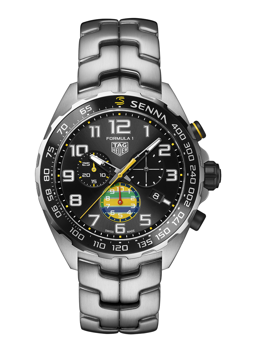 ブラジルGP™で発表された、こちらの限定モデルは「タグ・ホイヤー」のアンバサダーでもあった伝説のレーサー「アイルトン・セナ」とのパートナーシップを讃えるスペシャル・エディションです。サンレイ加工を施したサテン仕上げ・ブラックダイヤルの、6時位置にある1/10秒クロノグラフカウンターには、セナの故郷・ブラジルを象徴するイエロー、レッド、グリーン、ブルーのアクセントが配され、スポーティかつ鮮やかな表情を添えています。1987年に誕生した人間工学に基づくS字型「リンク・ブレスレット」は、スタイルと快適性を両立させた名作で、当時セナ本人も愛用したことから「タグ・ホイヤー」を象徴するデザインとして現在も受け継がれております。