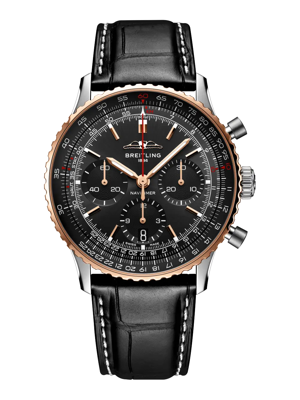 1952年の誕生以来、航空時計のシンボルとして揺るぎない地位を築いてきた傑作コレクション「ナビタイマー」より41mm径の日本限定・新作モデルが登場。文字盤をブラックのワントーンでシックにまとめ、ベゼルにはレッドゴールドを採用。エンブレムや針・インデックスにもゴールドカラーを取り入れる事で、より一層エレガントな佇まいとなりました。黒と金の雅な組み合わせが、腕元を重厚に飾ります。ムーブメントは約70時間のパワーリザーブを誇るCOSC公認クロノメーターの自社開発製造キャリバー「B01」を搭載。カレンダーの禁止時間帯もなく、ユーザー様ご自身による日付変更がいつでも可能です。