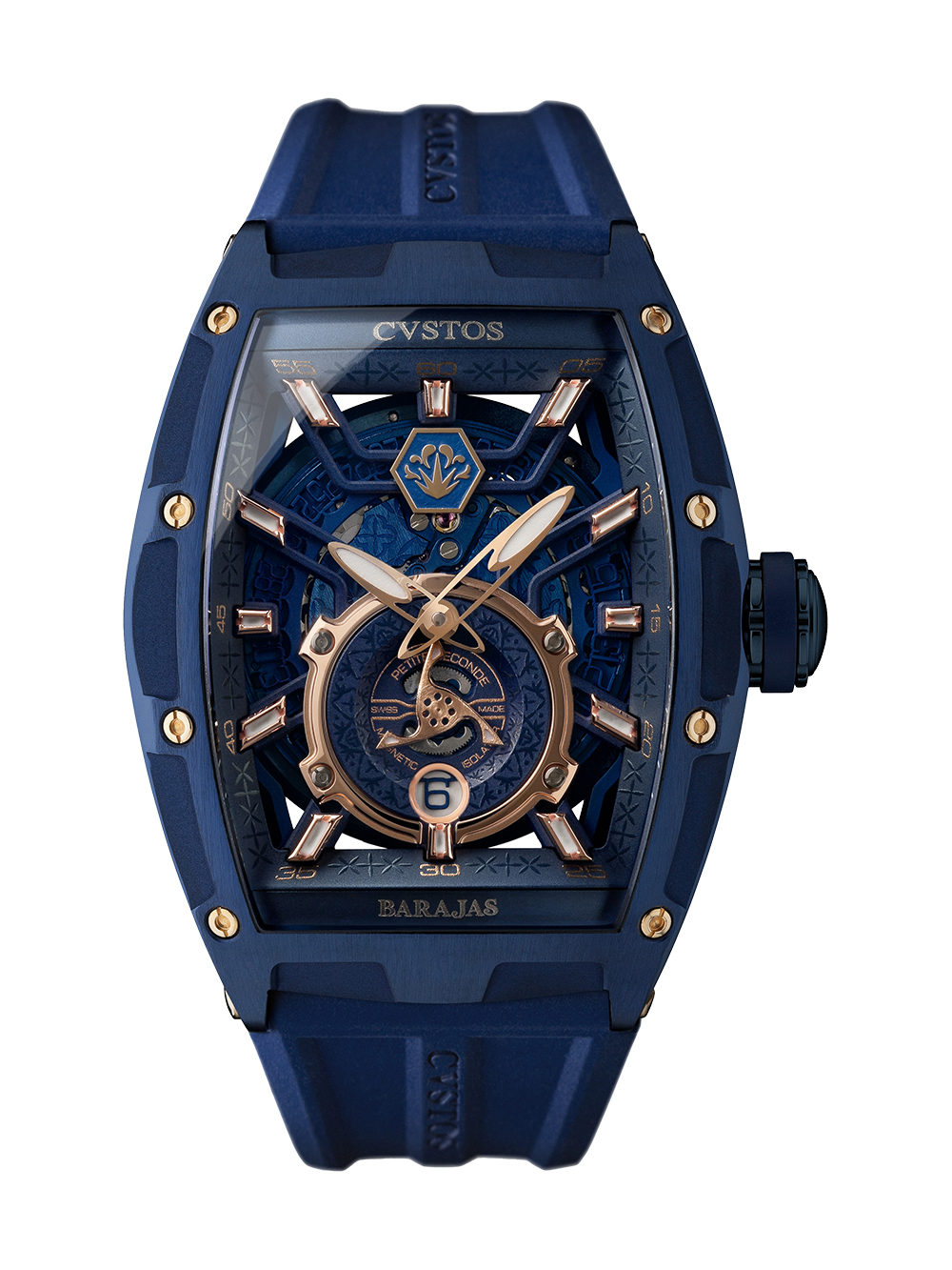 "究極の航空機" をコンセプトとした「チャレンジ・ジェットライナー」コレクションより、ブランド20周年を記念する限定モデルが登場。高級機械式腕時計の枠を超え、メキシコの伝統と革新を体現する芸術品「Tequila Barajas<テキーラ・バラハス>」とのコラボレーションが実現しました。ステンレススティールケースにネイビーブルーコーティングを施し、18Kレッドゴールドを随所にあしらうことで、洗練された中にも力強いアクセントをプラス。12時位置にはテキーラ・バラハスのロゴを配置し、クラシックな趣にモダンな要素を融合させることで、両ブランドに共通する革新的な精神を体現しています。さらに、クストスのために最高級Extra Añejo(エクストラ・アニェホ)を収めた "セルビン焼" のスペシャルボトルを制作。こちらの限定モデルのオーナー様へ特別に贈呈させて頂きます。