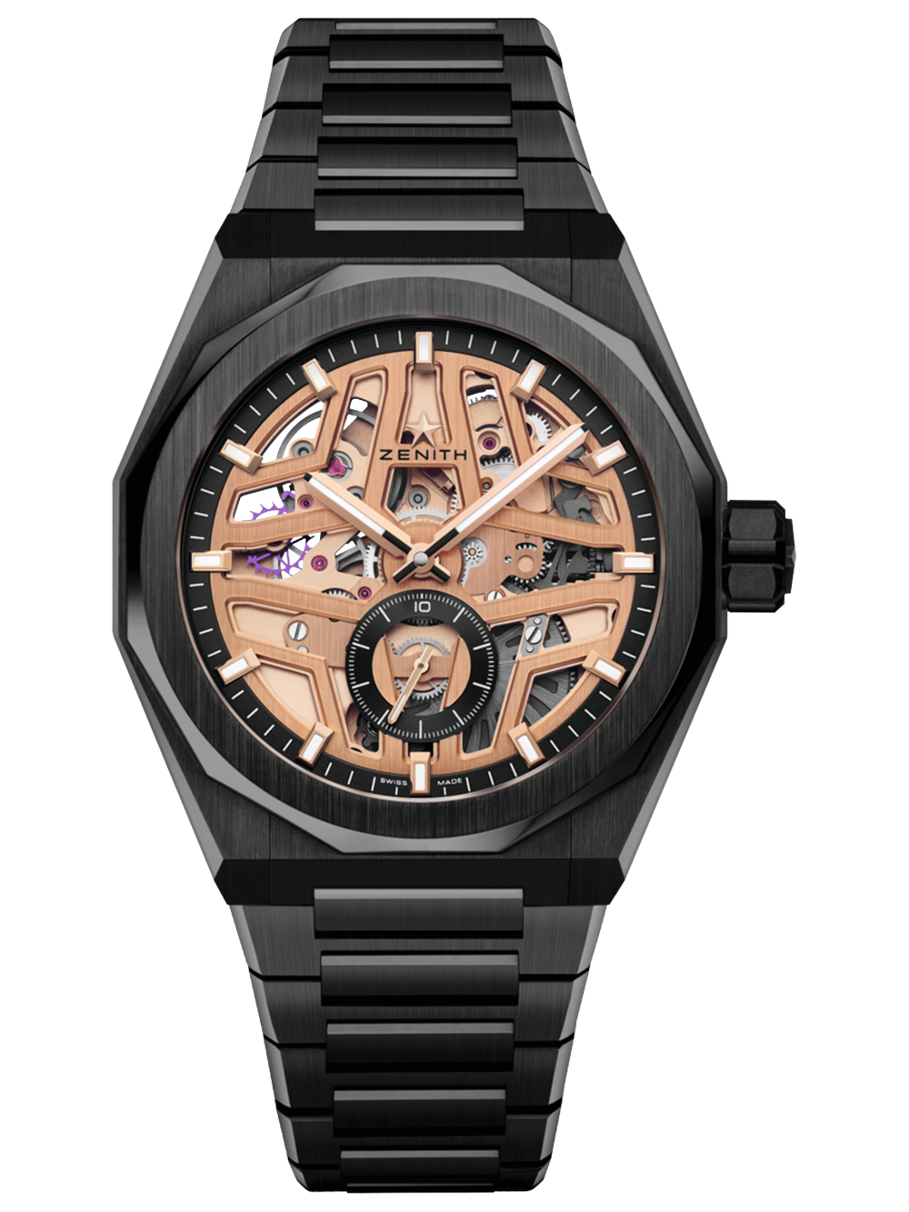 初期のデファイモデルのユニークな八角形のフォルムからインスピレーションを得たファセットカットの立体感が美しい「デファイ・スカイライン」より、ケースとブレスレットにブラックセラミックを取り入れた新作ラインナップが登場。ゴールドトーンの文字盤とムーブメントを組み合わせ、大胆さと優雅さを見事に調和させています。ゼニスの代名詞ともいえる傑作ムーブメントの最新型・3針キャリバー「エル・プリメロ 3620」を搭載し、約60時間のパワーリザーブと秒針停止機構を備えて、比類なき性能とさらに高い信頼性・メンテナンス性が実現。クイックストラップチェンジ機構により、セラミック製ブレスレットと付属のブラックラバーストラップをユーザー様ご自身で簡単に交換することが可能です。
