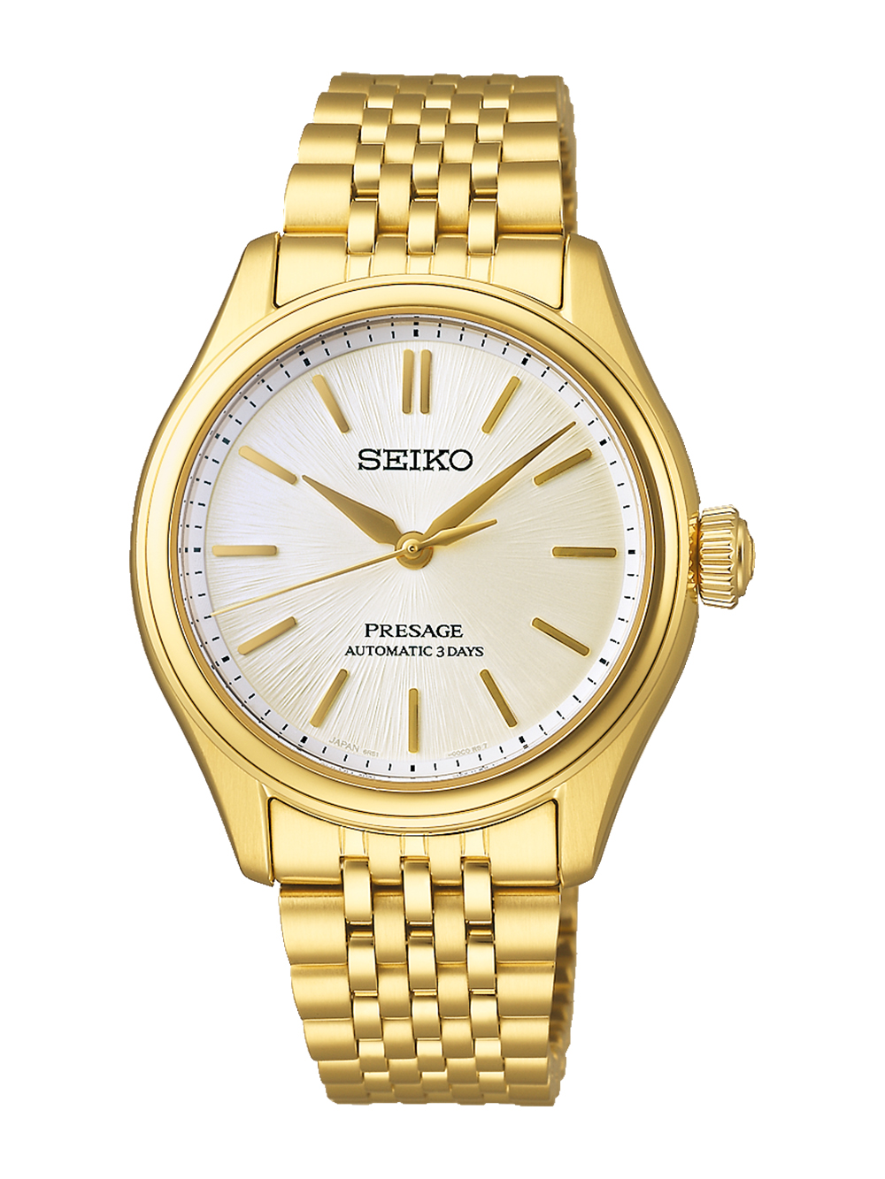 国内最高峰の時計製造技術と、深い歴史に裏打ちされたフィロソフィーが融合された国産機械式時計ブランド『キングセイコー』より、セイコー創業145周年記念・限定モデルが登場。滑らかな曲線を描く鏡面仕上げのケースと細やかな多列ブレスレットが相まって、繊細で優美な輝きを放つドレスウオッチです。文字盤にはセイコー創業者・服部金太郎のアイデアで当時の輸入懐中時計に施されていた、美しい彫刻から着想を得た緻密な型打文様と、深みのあるグレーのグラデーションを組み合わせました。セイコーの現行機種でも最も薄い自動巻ムーブメント「キャリバー6L35」を搭載することにより、ケース厚わずか9.9mmの薄型化が実現されております。