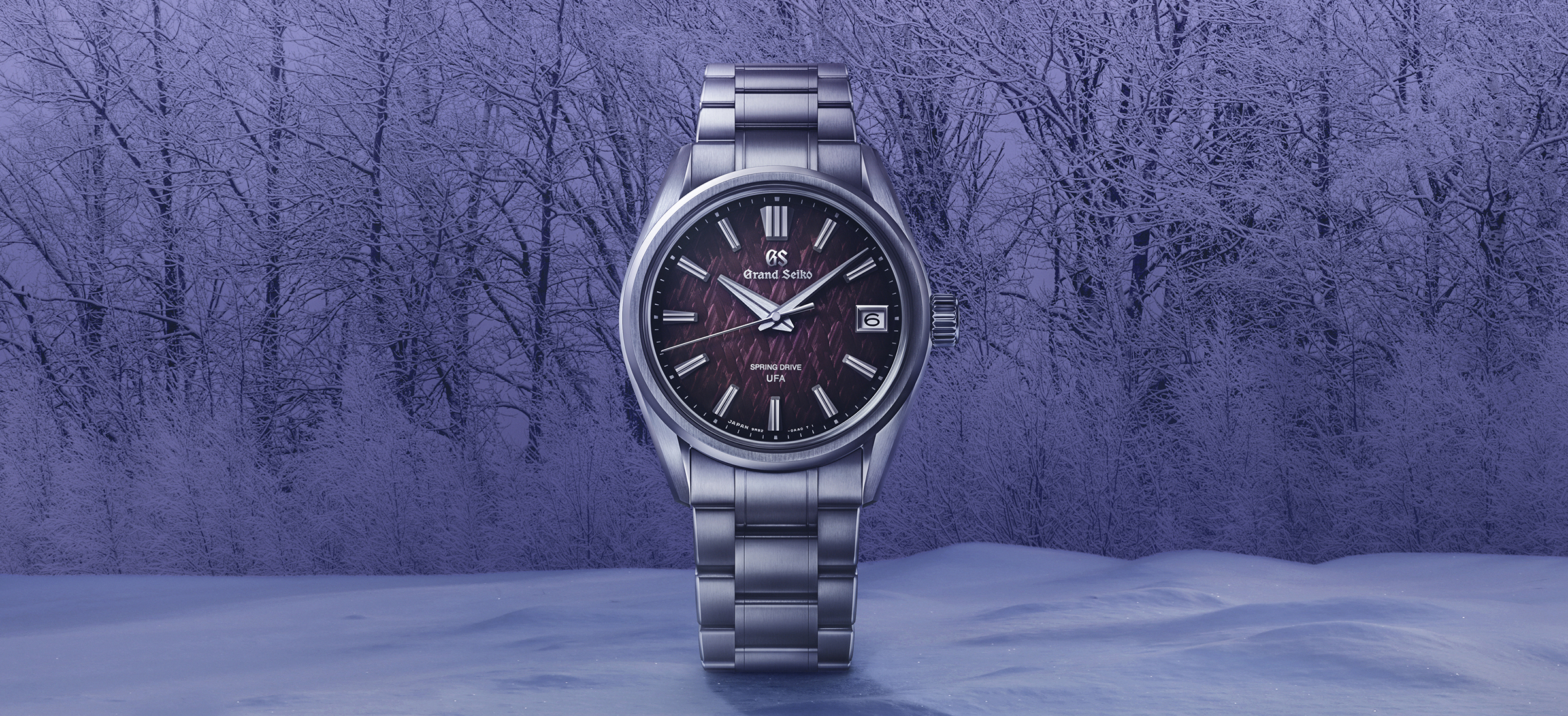 グランドセイコーの真髄と日本の美意識を高い次元で融合させた独自のデザイン文法「エボリューション9スタイル」をベースにした、スプリングドライブU.F.A.の限定モデルです。ダイヤルには、スプリングドライブの製造地である信州地方の「樹氷の森」が静かに目覚める夜明けの神秘的な情景を、精緻な型打模様とバイオレットカラーの繊細なグラデーションで表現しました。ムーブメントには、ぜんまい駆動式の腕時計としては世界最高の年差±20秒という高精度を実現した「キャリバー9RB2」を搭載しています。